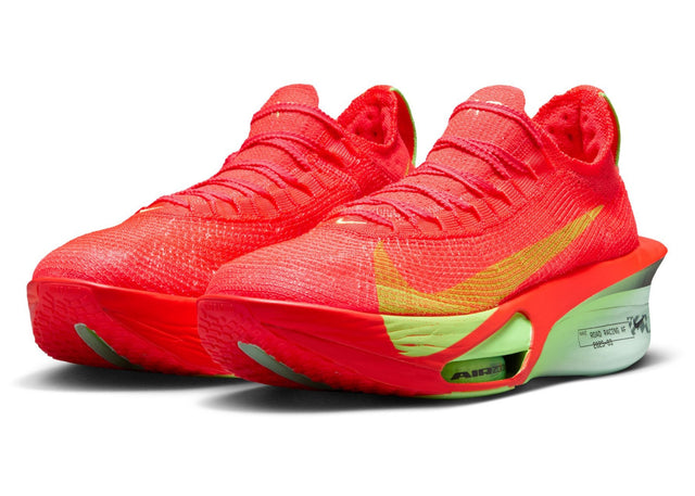 The Alphafly 3 is the lightest Alphafly ever, featuring a slightly wider carbon fiber plate for increased stability, a fully connected ZoomX foam midsole for smoother transitions and an all-new Atomknit upper designed for improved multidirectional containment and breathability. Notched laces offer a secure but soft lace-up, and an integrated knit tongue with lofted padding helps alleviate lace pressure.